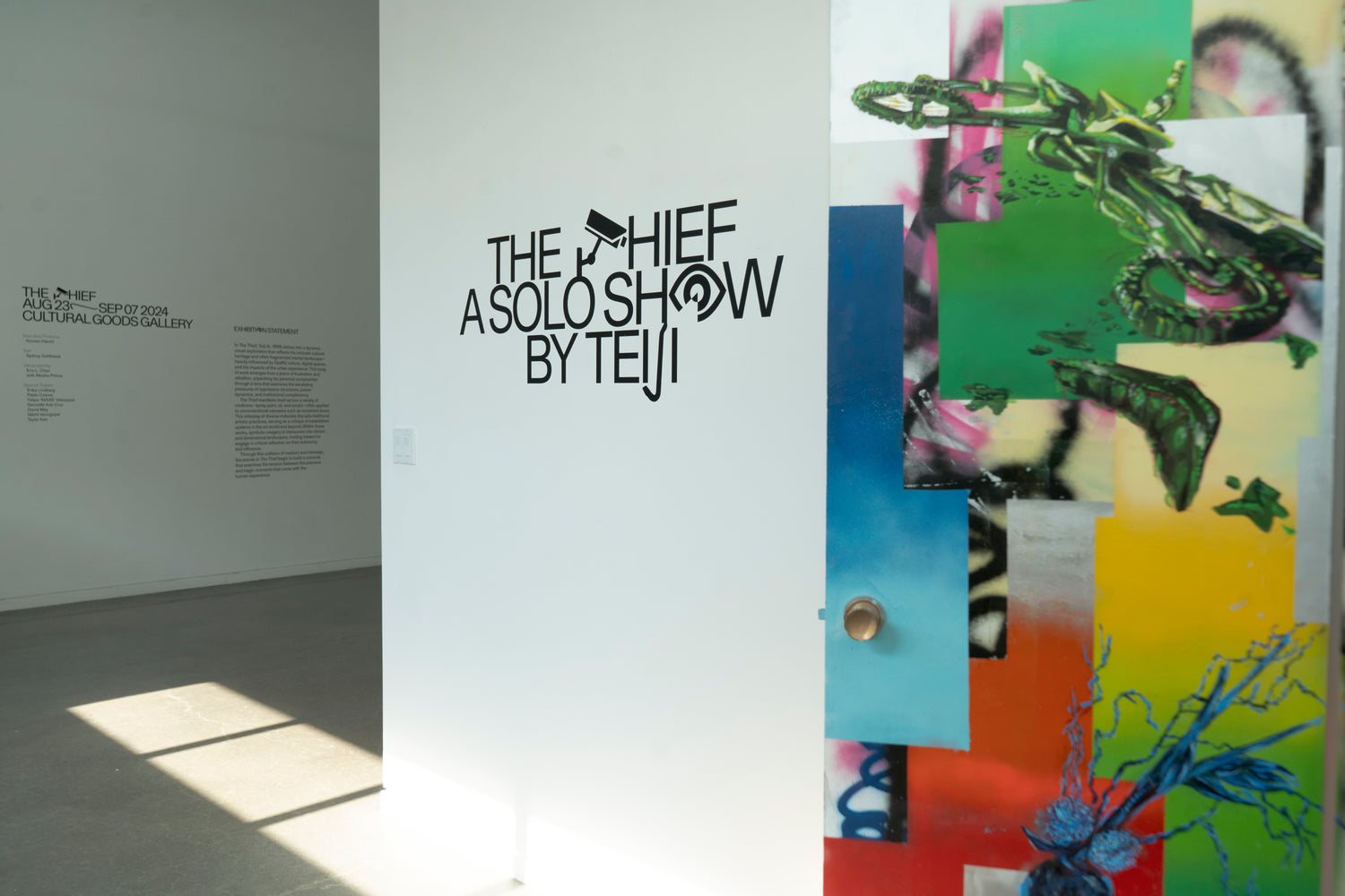 The Thief manifests itself across a variety of mediums—spray paint, oil, and acrylic—often applied to unconventional canvases such as reclaimed doors. This interplay of diverse materials disrupts traditional artistic practices, serving as a critique of established systems in the art world and beyond.
